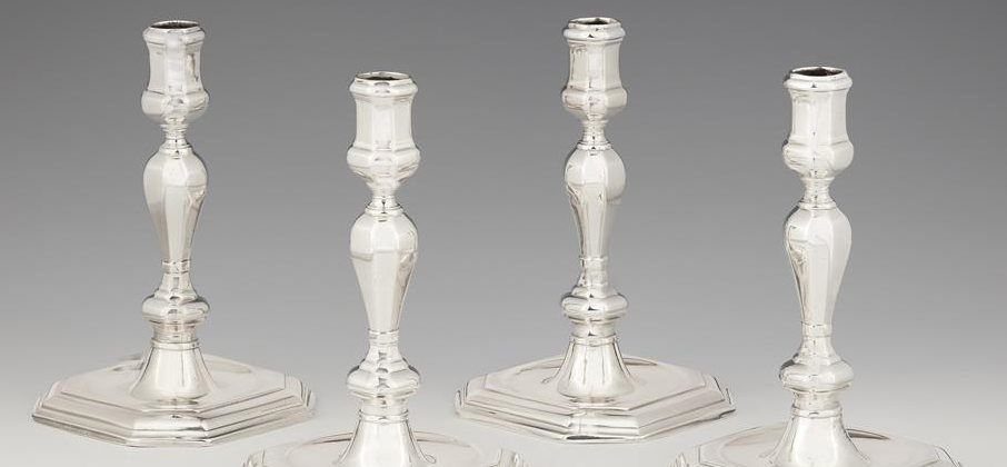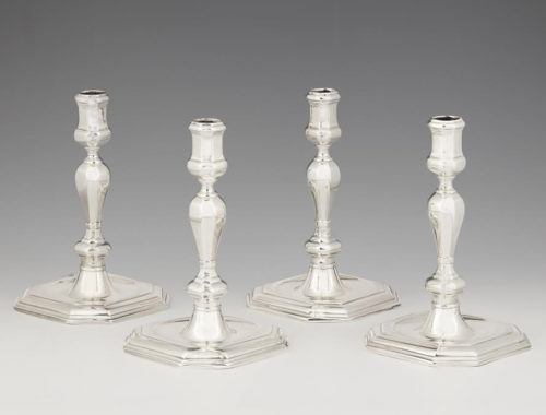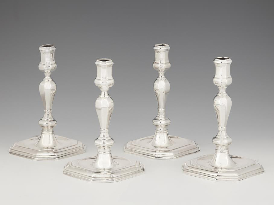 Silber. Quadratischer Fuß mit abgeschrägten Ecken; der Balusterschaft mit vasenförmiger Tülle.