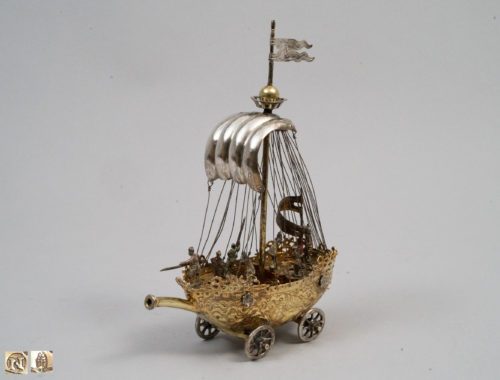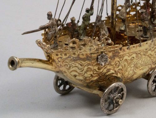 Das von Esaias zur Linden gefertigte silberne Miniatur-Segelschiff konnte auf Rädern beim Gelage effektvoll über die Tafel geschoben werden.