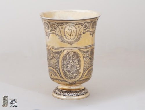Der vorliegende vermeil Becher ist ein sehr schön, elaboriertes Beispiel französischen Silbers vom Ende des 18. Jahrhunderts. Auf einem runden und leicht gewölbten Fuß erhebt sich der tulpenförmige Korpus mit ausladenden Lippenrand, welcher sich an die Anatomie des Mundes anpasst.