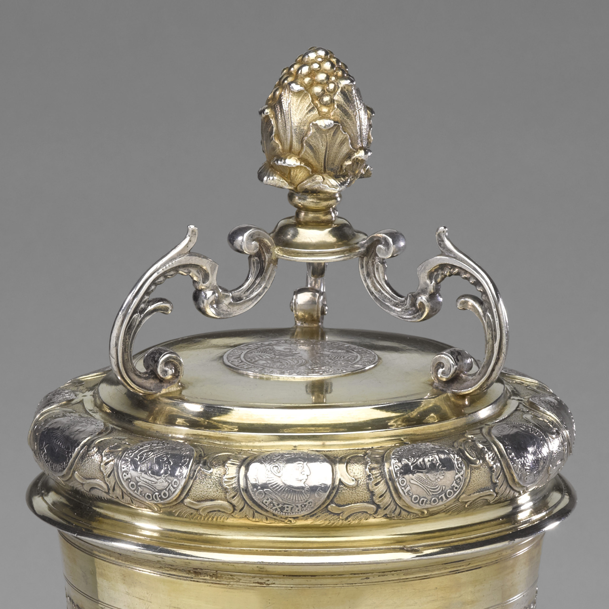 Der vorliegende Becher hat ausgewogene Proportionen, eine sehr gute Bearbeitung des Fußes und des profilierten Lippenrandes, tief eingezogenen Kehle unterhalb des ausladenden Deckelwulstes und der glatten Mittelfläche des Deckels über einer zarten Kehlung. Er steht auf einem runden, gewölbten und profilierten Fuß, der vergoldet und verziert ist mit silbernen Münzen. Ein glatter, profilierter Ring verbindet Fuß und Korpus. In der Becherwandung sowie in den Wülsten von Fuß und Deckel insgesamt 72 Groschenmünzen von Brandenburg-Preußen und Polen, meist aus dem 2. Viertel des 16. Jahrhunderts. Die silbernen Münzen des vergoldeten Korpus sind umfangen von einem dichten Netzwerk getriebener und ziselierter Rocaillen über einem punzierten Grund. Der Deckel ist sehr prachtvoll gestaltet: Gewölbt, mit Münzen und getrieben Rocaillen geschmückt. Über dem Taler im Deckel tragen drei gegossene und ziselierte Doppel C-förmige Spangen – die eine Art von Baldachin gestalten – einen kräftigen, gegossenen, und von Kelchblättern umhüllten, Fruchtzapfen. Im Boden und in der Mitte des Deckels je ein Taler der Markgrafen Georg der Fromme (1484-1543) und Albrecht II. Alcibiades von Brandenburg-Kulmbach (1522) aus den Jahren 1540 und 1541 (sie haben gemeinsame Münzen bis 1545 geprägt).