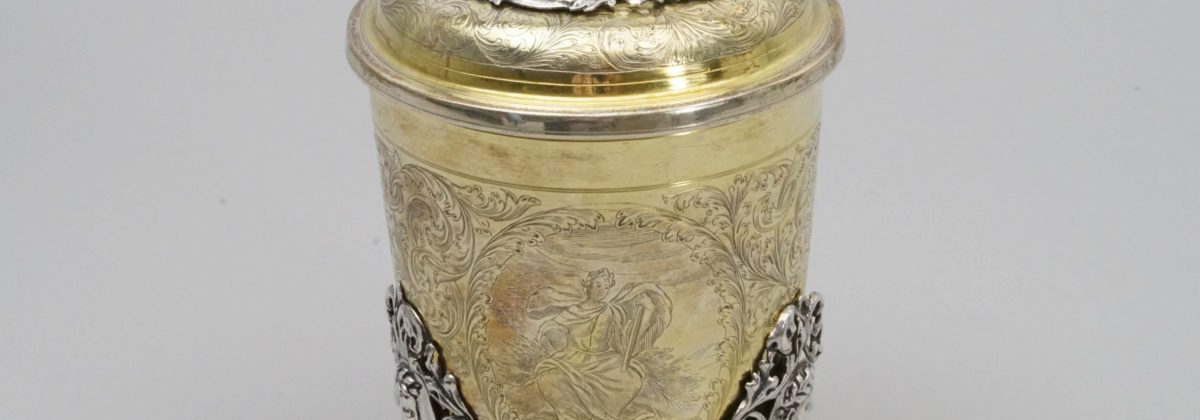 Fast zeitgleich mit dem Silber vergoldeten Augsburger Kugelfußbecher mit kunstvoll gravierten Landschaften von Johann Christoph I Treffler #123 entstand dieser aufwendig gravierte, auf drei zierlichen Kugeln fußende Deckelbecher von dem Augsburger Goldschmied Johann Jebenz.