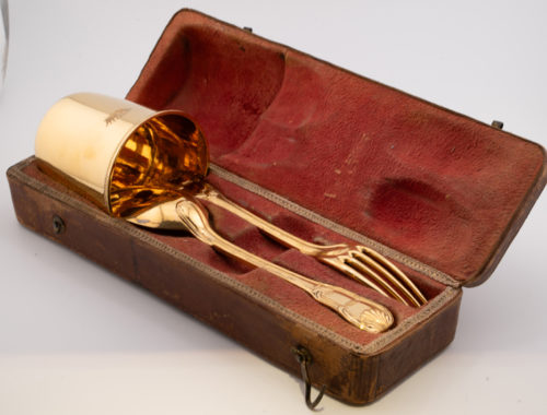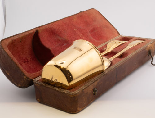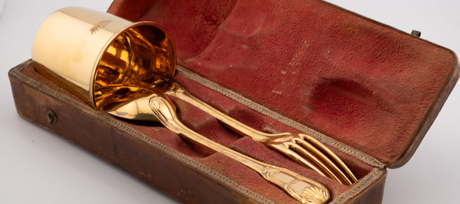 Gabel und Löffel mit der Marke von Gottfried Imlin, 1765; der Becher mit der Marke von Jacob Heinrich Henri Alberti, 1779