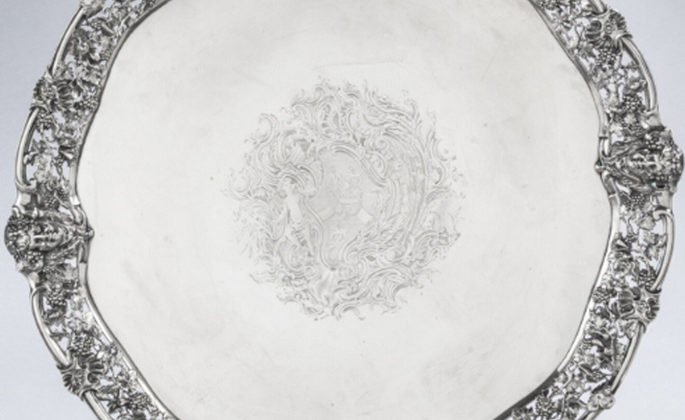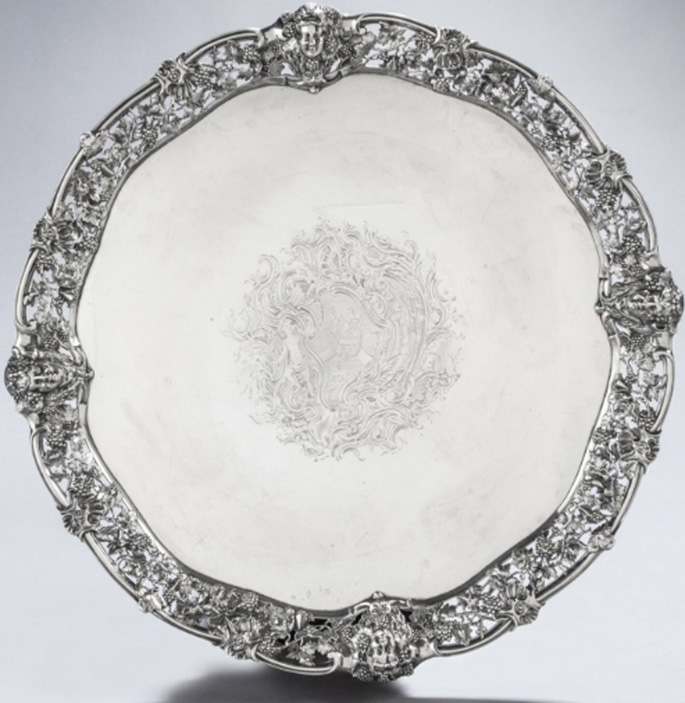 kreisförmig, auf vier geschwungenen Füßen, der Rand mit Trauben und weiblichen Masken durchbohrt, in der Mitte ein großes Wappen eingraviert, unten mit dem Gewicht “168=6” graviert