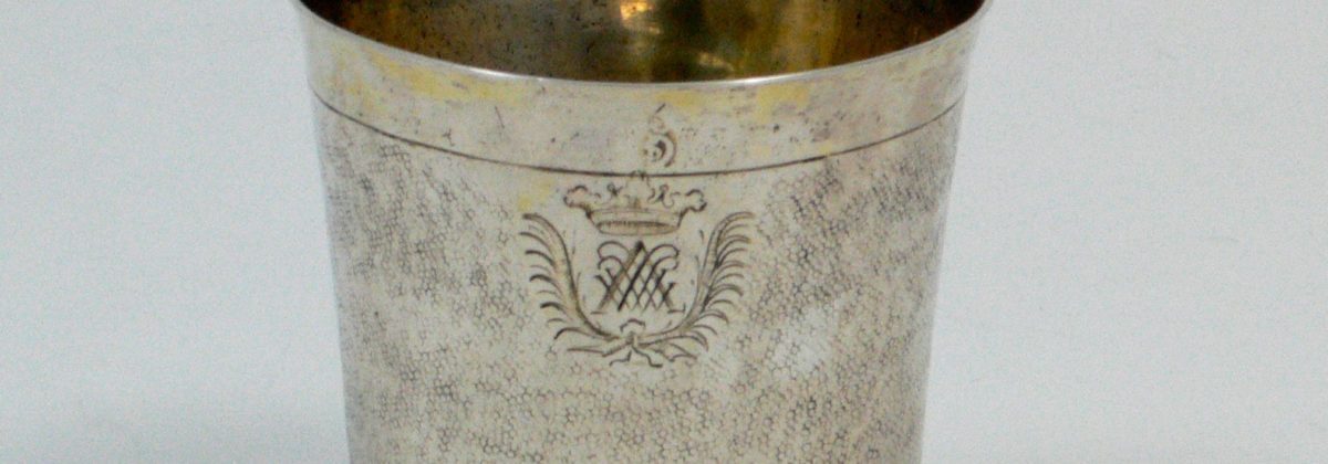 Leicht konische Form. Zwischen den glatt belassenen Randzonen ist die Wandung fein punziert in einem als Fisch oder Schlangenhaut gezeichneten Muster.