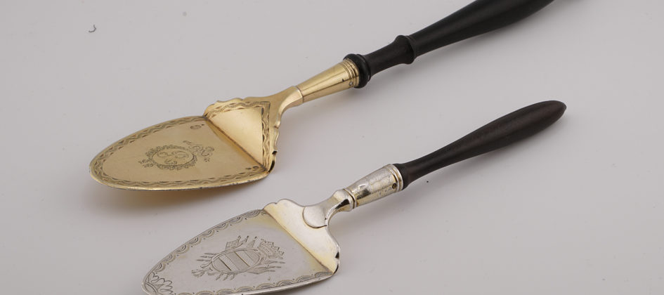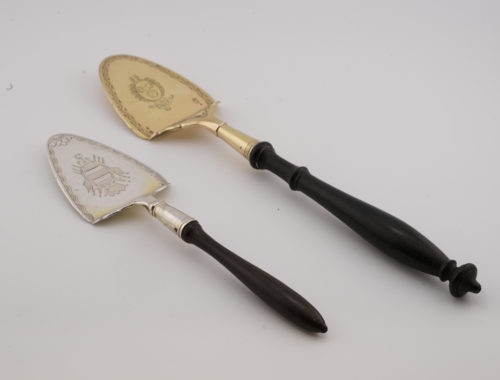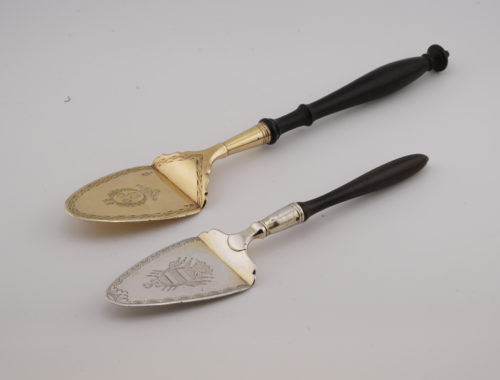 Schlicht, mit geometrischem Fries verziert, eine mit dem Initial R in einem floralen Schleifenkranz graviert, die andere rückseitig mit „EA“ graviert, die Griffe aus geschwärztem Birnbaumholz, die erste mit Punzen auf der Schaufel: Anerkennung und Meister-Silberschmied, und auf der Unterseite eine kleine Garantiemarke, die von 1809 bis 1819 verwendet wurde; die zweite mit Punzen auf der Unterseite: Anerkennung und Meister-Silberschmied; Oben: Ausländische Werke 1798–1809, große und mittlere Pariser Punzen, verwendet von 1809 bis 1819